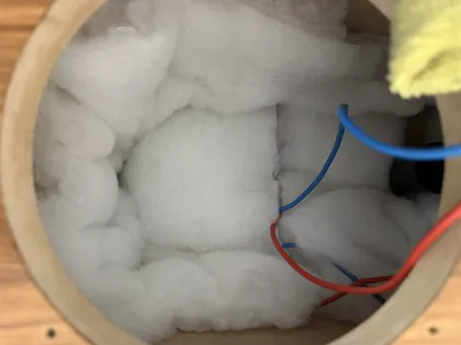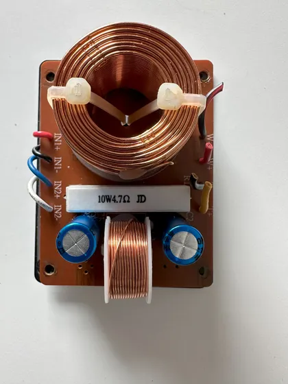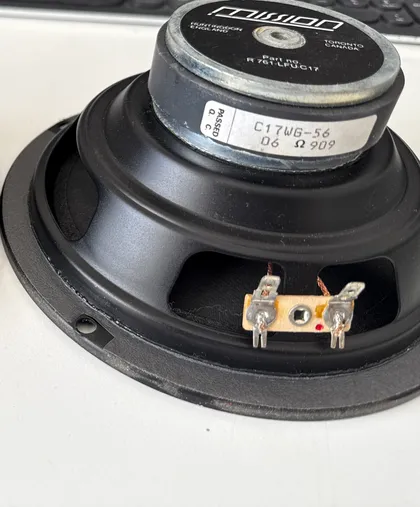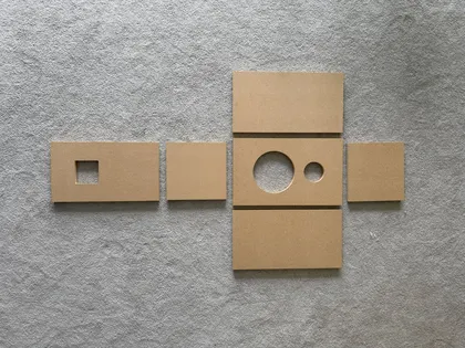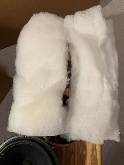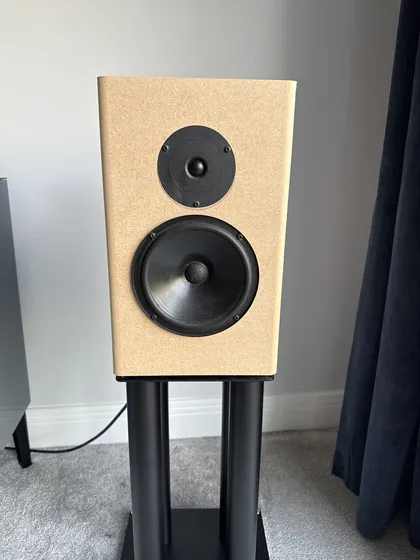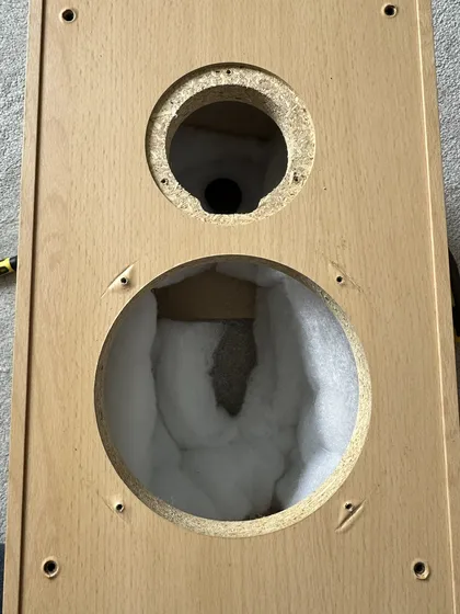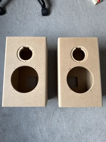 Simple butt-joint MDF cabinets. Order panels pre-cut (I used CutMy in the UK), glue with Titebond, and clamp square. Cut rebates for the tweeter, flush-mount both drivers, and drill for a rear terminal cup. Copy the original AX-2 layout and driver spacing as closely as you can. Overall dimensions: 376 mm (H) × 230 mm (W) × 220 mm (D).
